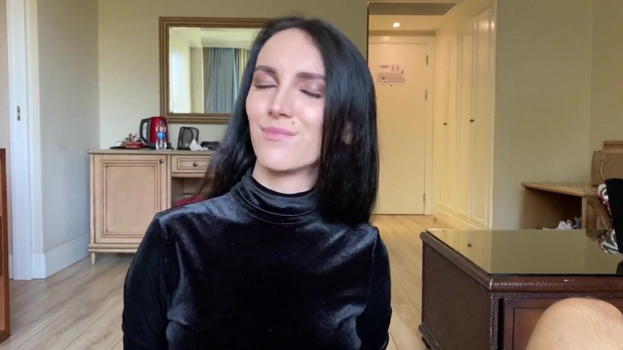 A hot brunette babe in a velvet dress gets kinky, taping her partner's mouth shut before giving him a POV handjob. She teases him until he cums all over her pretty face, with her big dick delivering a hot load.
